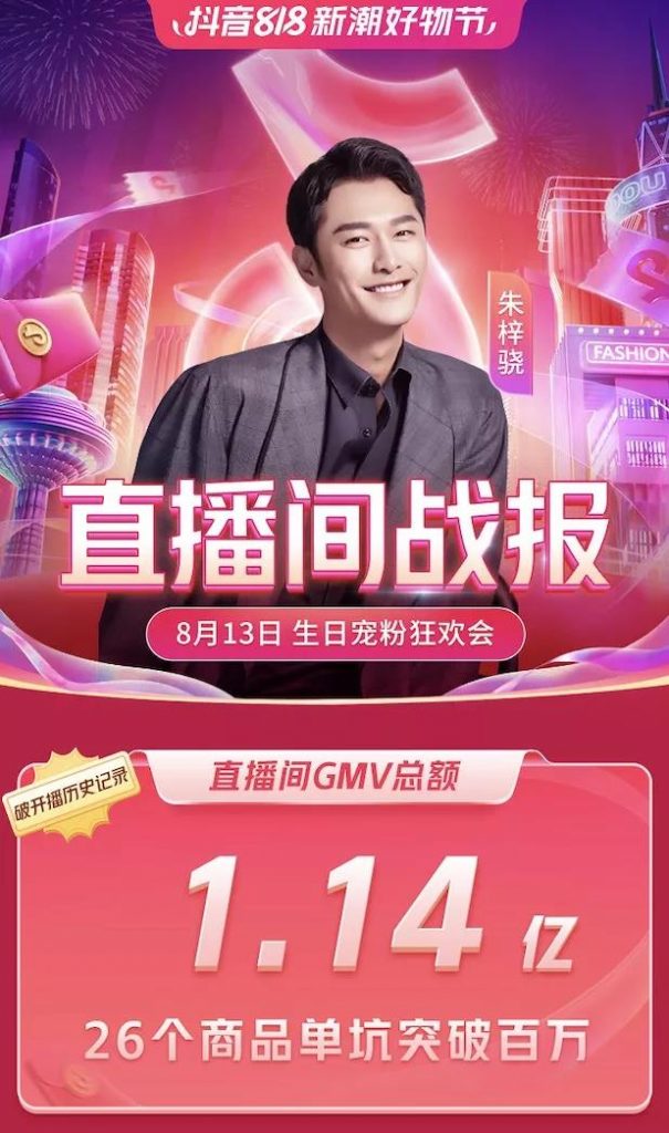 還有從演員轉(zhuǎn)為帶貨主播的朱梓驍,在8月13日開設(shè)的生日寵粉狂歡會(huì)直播專場。朱梓驍依然延續(xù)自己段子手的人設(shè),在跟粉絲的調(diào)侃中不斷帶著粉絲了解產(chǎn)品,以親切的表述和歡快的環(huán)境成功讓很多粉絲種草,最后該直播專場GMV總額達(dá)1.14億,這也成為朱梓驍?shù)男录o(jì)錄。