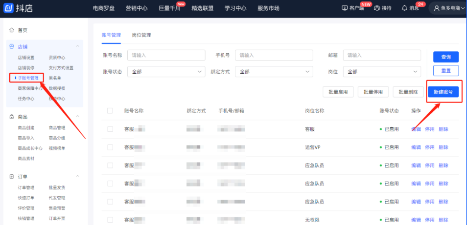1. 使用主賬號(hào)登陸【商家后臺(tái)】-點(diǎn)擊【店鋪】-點(diǎn)擊【子賬號(hào)管理】-在【賬號(hào)管理】頁(yè)面,點(diǎn)擊【新建賬號(hào)】;