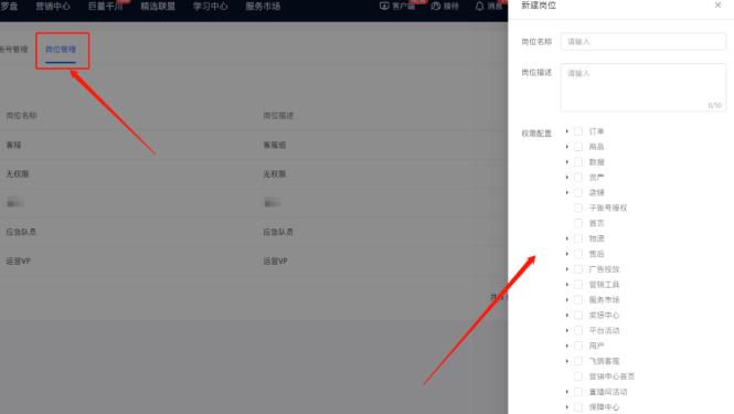 4. 填寫(xiě)“崗位名稱”“崗位描述”,并在“權(quán)限配置”處勾選希望該崗位能夠看到的后臺(tái)功能模塊;具體字段填寫(xiě)說(shuō)明如下: