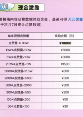 我們看一下這個(gè)表格,大于等于50的點(diǎn)贊量,收益是30,大于等于100的點(diǎn)贊量收益是50,這些點(diǎn)贊量是不是不難?50的點(diǎn)贊量100的點(diǎn)贊量,這個(gè)很容易就達(dá)到,如果你的視頻可以達(dá)到等于大于300的點(diǎn)贊量,可以獲得200元的收益,如果你視頻的點(diǎn)贊量小于或者是等于30萬呢,就可以獲得一萬元的獎(jiǎng)勵(lì)。
