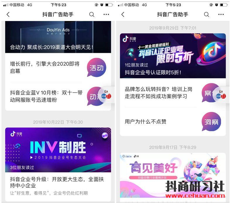 抖音廣告助手公眾號(hào)展示的是抖音最新咨詢、產(chǎn)品新功能以及企業(yè)藍(lán)V賬號(hào)的經(jīng)典案例。