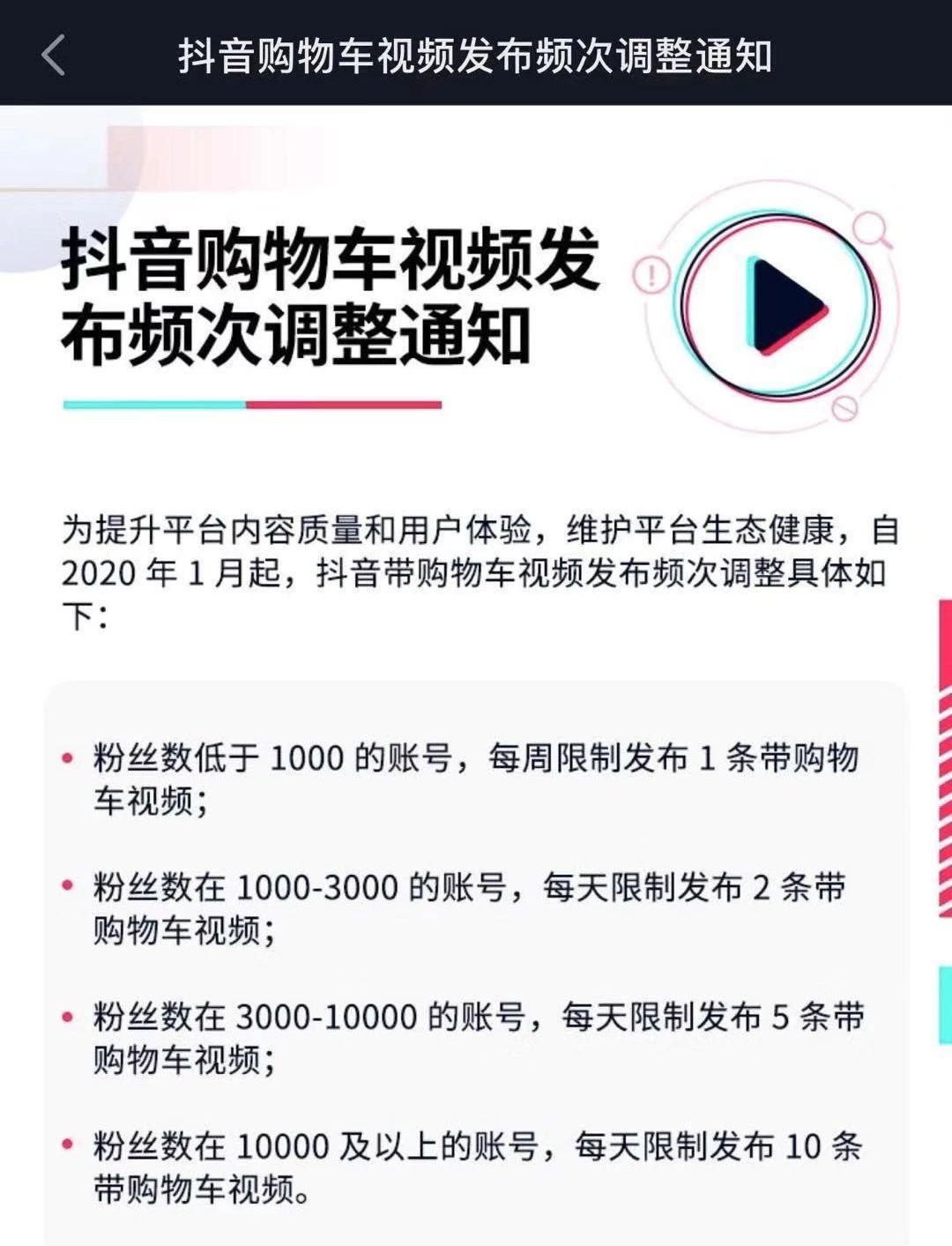粉絲在10000以上的賬號(hào),每天限制發(fā)布10條帶購(gòu)物車視頻。