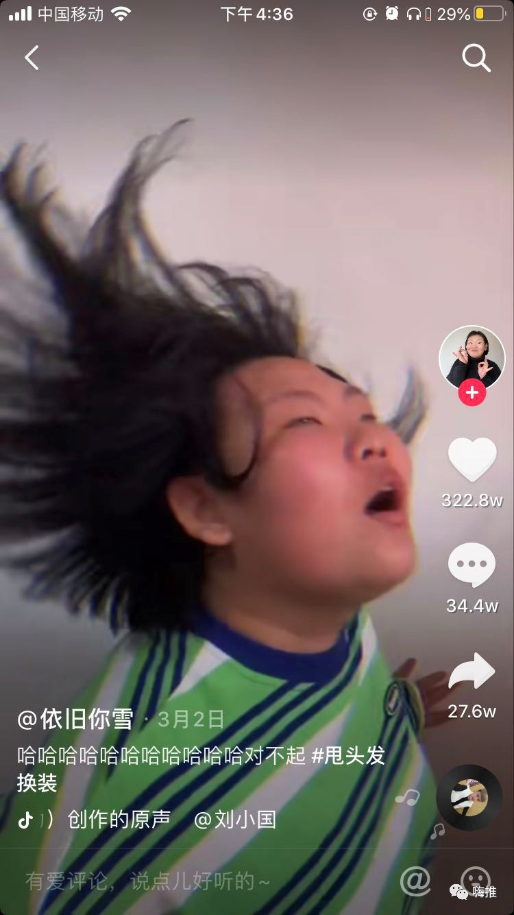 玩法分析: 沒有像原視頻一樣走顏值路線,甩頭反轉(zhuǎn),而是延續(xù)了自己的搞笑風(fēng)格 ,在原有的畫風(fēng)基礎(chǔ)上結(jié)合熱點(diǎn)素材加以創(chuàng)新,增加視頻看點(diǎn)和差異化;