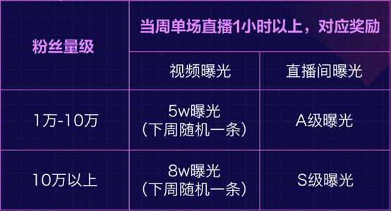 活動期間,1萬-10萬粉絲達(dá)人,單周單場直播1小時以上,下周發(fā)布的視頻,隨機一條可以獲得5W曝光。10萬粉絲以上達(dá)人,則可以得到8W曝光。