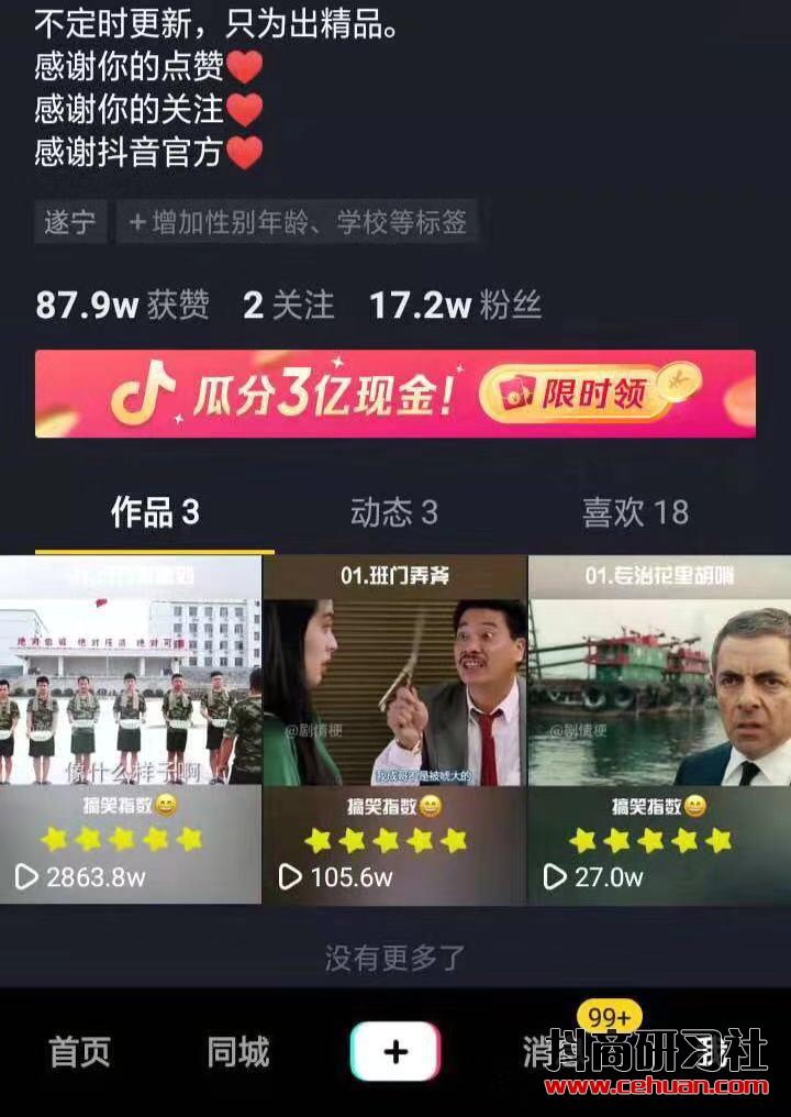 新賬號(hào)僅僅發(fā)布3個(gè)視頻,漲粉17萬(wàn) ;第一個(gè)視頻播放量15萬(wàn)+,第三個(gè)視頻播放量突破1700W+。