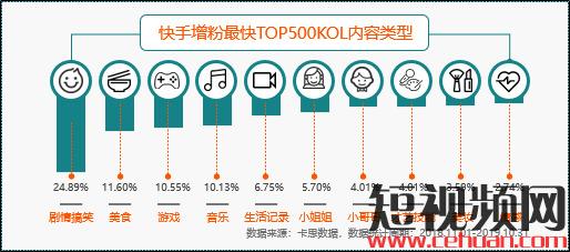 那么,問題來了,到底做什么樣的內(nèi)容號(hào)在快手上漲粉更迅速呢?從快手增粉最快的TOP500KOL內(nèi)容類型看:劇情/搞笑、美食、游戲、音樂和VLOG類賬號(hào)增粉最快。這說明在快手上做內(nèi)容,還是要貼近人們的生活,泛娛樂、泛生活類賬號(hào)更容易高效吸粉。