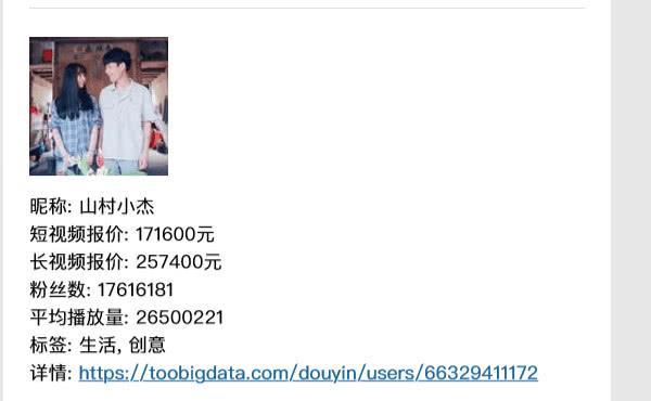 山村小杰,一對(duì)生活在大山里靠竹子做各種家具秀恩愛(ài)的抖音主,粉絲量17616181,報(bào)價(jià)短視頻17.1萬(wàn),長(zhǎng)視頻25.7萬(wàn)。